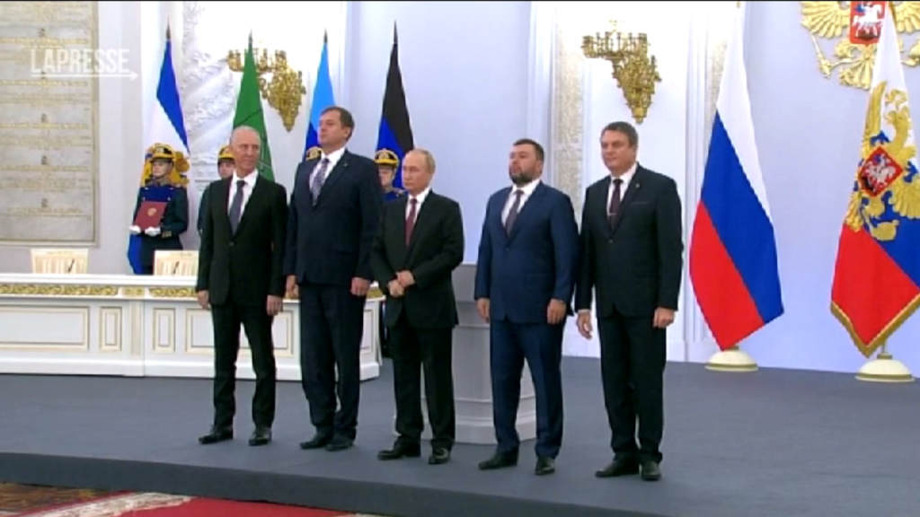 Il presidente russo Vladimir Putin e i capi delle Repubbliche popolari di Donetsk e Lugansk, delle regioni di Zaporizhzhia e Kherson hanno firmato al Cremlino gli accordi sull’adesione di queste regioni alla Russia.