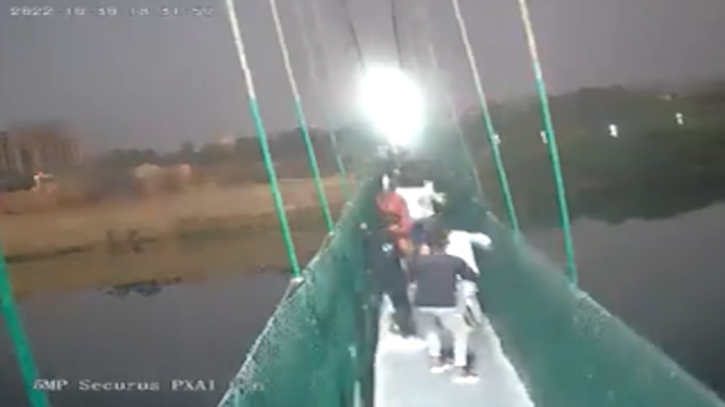 (LaPresse) Stanno facendo il giro del web le drammatiche immagin del momento del crollo del ponte pedonale sopra un fiume nello Stato indiano occidentale del Gujarat, in India. Oltre 130 le vittime ma le squadre militari stanno ancora cercando le persone scomparse. Il ponte sospeso di epoca coloniale era stato riaperto quattro giorni fa, dopo alcune riparazioni. I funzionari locali hanno detto che il ponte ha ceduto perché era sovraccarico di turisti accorsi per la stagione dei festival indù.