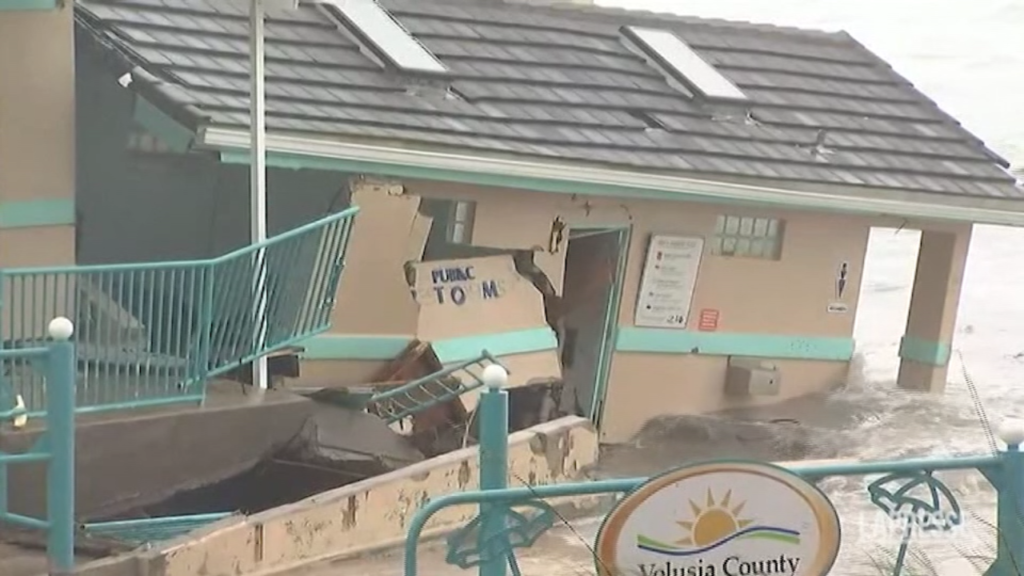 La tempesta tropicale Nicole si è abbattuta sulla Florida trasformandosi in uragano giovedì, spazzando via edifici e staccionate. A Daytona Beach Shores, l’acqua dell’Oceano ha minacciato le fondamenta di almeno una dozzina di condomini e case di alto livello. Il maltempo ha raggiunto anche la Georgia e North e South Carolina. CREDIT WFTV-TV