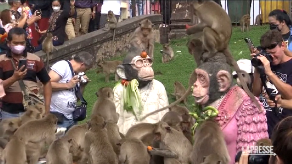 In Thailandia è andato in scena il Monkey Feast Festival di Lopburi. File di statue di scimmie allineate all’esterno del complesso delle Antiche Tre Pagode, mentre i volontari preparavano il cibo dall’altra parte della strada. Le scimmie sono considerate un simbolo della provincia, situata a circa 150 chilometri a nord di Bangkok. Decine di scimmie macaco correvano libere tra la folla. Il festival è una tradizione annuale di Lopburi, che si tiene per mostrare gratitudine alle scimmie per aver accresciuto il turismo nella zona.