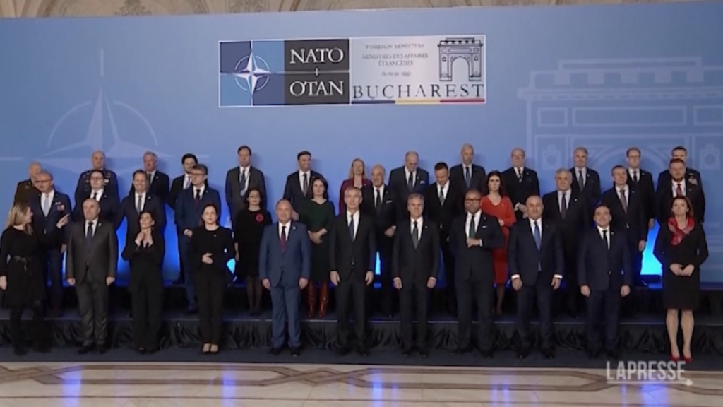 Foto di rito dei ministri degli Esteri della NATO riuniti per un incontro a Bucarest. L’Alleanza si impegnerà a fornire nuovo sostegno non letale all’Ucraina: carburante, generatori, forniture mediche, attrezzature invernali e dispositivi di disturbo per droni. È probabile che anche i singoli alleati annuncino nuove forniture di equipaggiamento militare per l’Ucraina – soprattutto i sistemi di difesa aerea che Kiev cerca disperatamente per proteggere i suoi cieli – ma la NATO, come organizzazione, non lo farà, per evitare di essere trascinata in una guerra più ampia con la Russia, dotata di armi nucleari.
