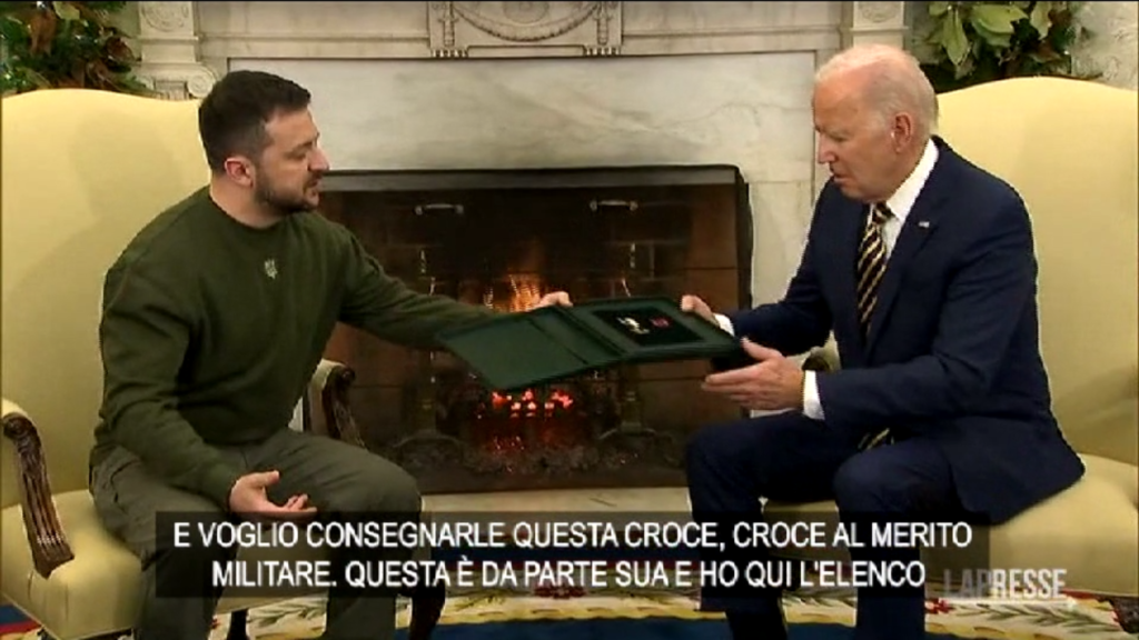 Come dono per Joe Biden, Volodymyr Zelensky ha portato con sé alla Casa Bianca un’onoreficenza militare, dono di un soldato ucraino, che ha consegnato a Joe Biden. “Non la merito ma la appprezzo molto”, ha detto Biden, nel breve scambio di battute davanti alla stampa, prima dell’inizio del colloquio riservato tra i due leader nello Studio Ovale.