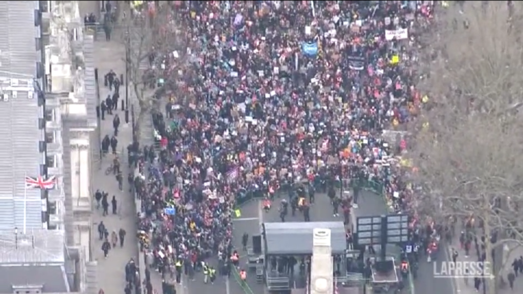 Migliaia di persone in manifestazione nel centro di Londra per chiedere al governo un aumento degli stipendi per i dipendenti pubblici. Oggi il maxi-sciopero nel Regno Unito ha coinvolto diverse categorie di lavoratori. La folla si è radunata fuori dalla Broadcasting House, con cartelli e un enorme pallone gonfiabile, prima che i capi sindacali Mick Lynch, segretario generale della Rmt e Mary Bousted, segretaria generale congiunta della Neu, guidassero la marcia lungo Regent Street verso Parliament Square.