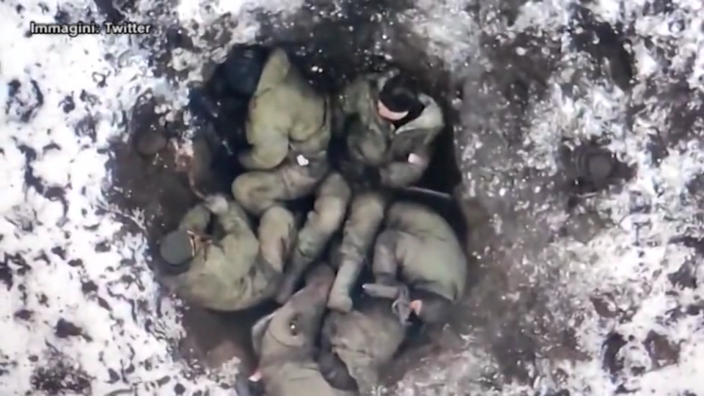 Ancora una volta, dal conflitto in Ucraina arrivano immagini terribili. Un drone sgancia una bomba in una buca dove sono rintanati sei militari, probabilmente russi, in mezzo a un terreno innevato. I soldati non riescono a fuggire perché congelati dal freddo. L’ipotermia ha rallentato i loro movimenti. Anziché tentare la fuga, i militari si rannicchiano ancora di più. L’ordigno esplode tra loro.