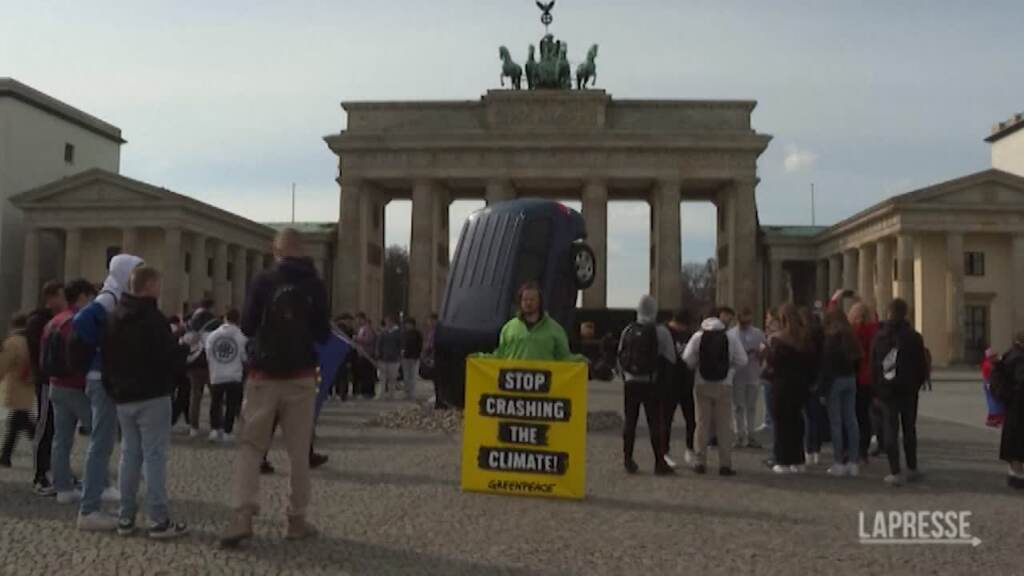 Un’auto piantata in verticale nel mezzo di Pariser Platz, davanti alla Porta di Brandeburgo di Berlino, in Germania. E’ la protesta messa in atto dagli attivisti di Greenpeace contro il governo tedesco. In particolare gli ambientalisti hanno puntato il dito contro il ministro dei Trasporti Volker Wissing. Quest’ultimo ha dichiarato di non voler sostenere il divieto previsto dall’Unione Europea di vendere nuove auto a benzina e diesel a partire dal 2035, dopo non aver ottenuto garanzie dall’esecutivo per un’esenzione sui carburanti sintetici. L’anno scorso i legislatori dell’Ue e gli Stati membri avevano raggiunto un accordo che obbligherebbe le case automobilistiche a ridurre le emissioni delle nuove auto del 55% nel 2030 rispetto ai livelli del 2021 e del 100% nel 2035.