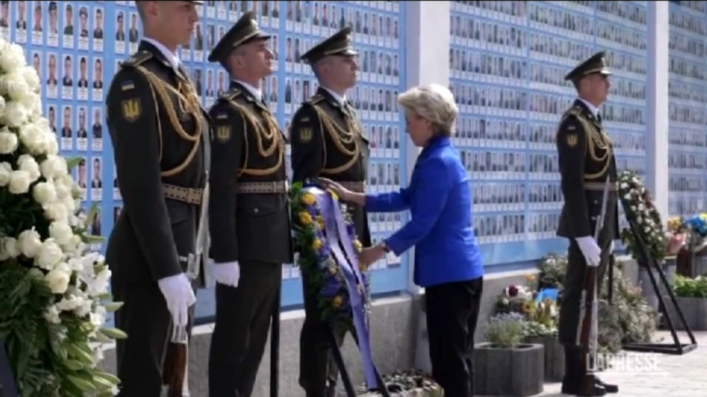 Nel corso della sua visita a Kiev, in Ucraina, la presidente della Commissione europea Ursula von der Leyen ha deposto una corona di fiori davanti al Muro della Memoria, che commemora i caduti in guerra. Von der Leyen si è raccolta in un momento di preghiera davanti al memoriale.