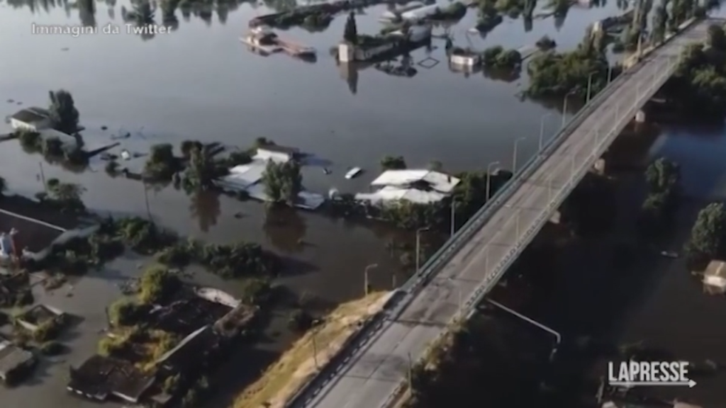 Il governatore dell’oblast di Kherson Oleksandr Prokudin ha pubblicato sui social un video in cui si vede la zona adiacente al villaggio di Oleshky situato sulla riva sinistra del Dnepr, inondato dall’acqua dopo la distruzione della diga della centrale idroelettrica di Kakhovka, attribuita da Kiev all’esercito russo. Nelle immagini si vede l’acqua sommergere tutta la pianura arrivando fino a sfiorare la cima degli alberi.