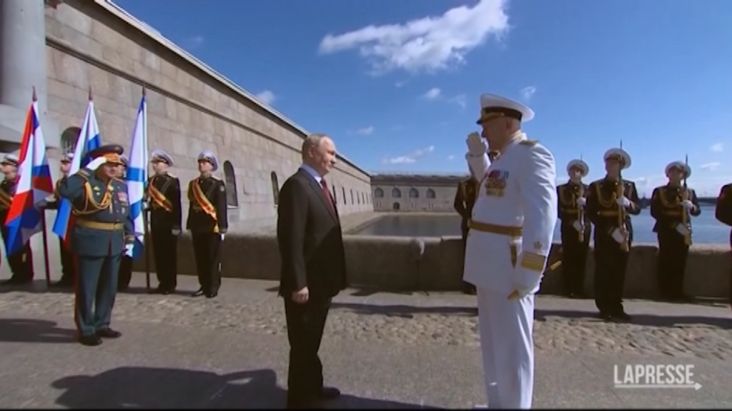 Vladimir Putin ha partecipato domenica a una parata navale a San Pietroburgo, in occasione della celebrazione della Giornata della Marina. Decine di marinai hanno reso omaggio al presidente russo, in piedi sui ponti delle loro navi.