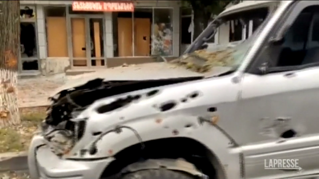 Il governo ha dichiarato di aver preso di mira solo siti militari, ma si sono registrati danni significativi nelle strade della capitale regionale, Stepanakert (chiamata Khankendi dall’Azerbaigian), con vetrine di negozi saltate in aria e veicoli perforati apparentemente da schegge.