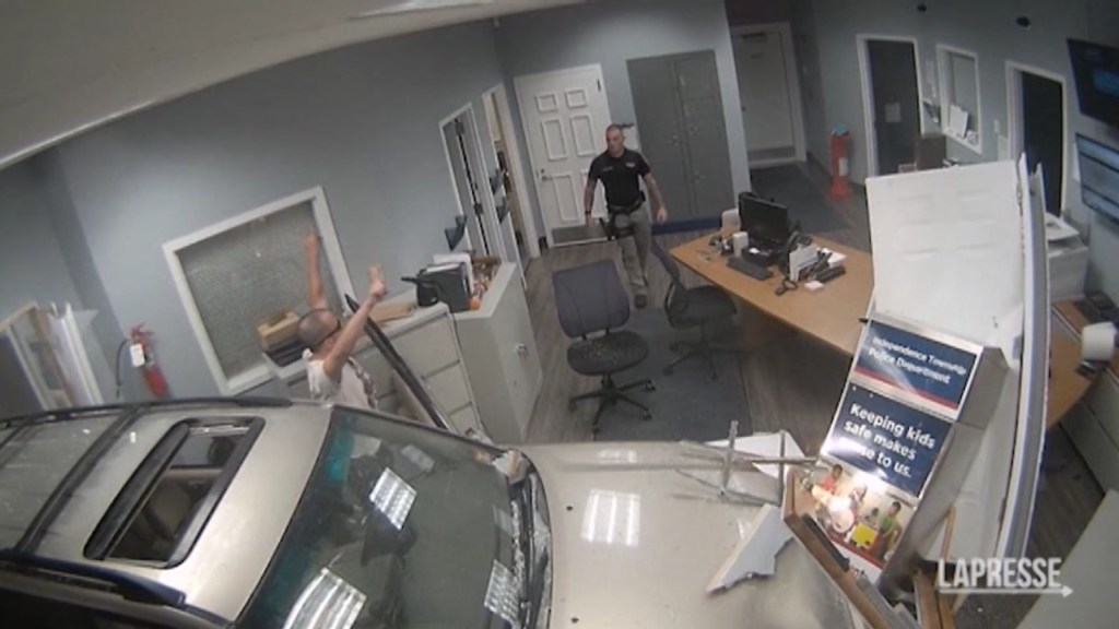 Scene di ordinaria follia nella piccola cittadina di Indinpendence Township, nella Contea di Warren in New Jersey, dove un uomo ha sfondato l’ingresso della stazione di polizia con il proprio suv. Un atto deliberato, secondo quanto dichiarato poi dagli agenti, che fortunatamente non ha avuto nessuna conseguenza se non i danni provocati alla struttura. La scena è stata ripresa dalle telecamere di sicurezza della stazione. Nelle immagini si vede l’uomo, John Hargreaves, 34enne di Belvidere, scendere dall’auto con le mani alzate dopo distrutto l’ingresso della piccola stazione di polizia. Gli stessi agenti hanno poi raccontato che dalle casse del suv suonava a tutto volume “Welcome to the jungle” dei Guns ‘N Roses.