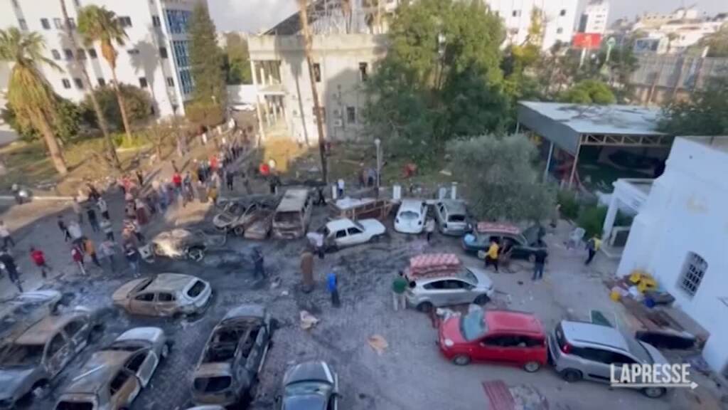 Macerie e auto distrutte dalle fiamme nel parcheggio dell’ospedale Al-Ahli di Gaza City dopo l’attacco di martedì che ha provocato centinaia di morti. La struttura era piena di feriti e di palestinesi che cercavano riparo quando è avvenuta la deflagrazione, ha dichiarato il Ministero della Sanità. Hamas ha attribuito la responsabilità a un attacco aereo israeliano, mentre l’esercito israeliano parla di un razzo lanciato dalla Jihad islamica.