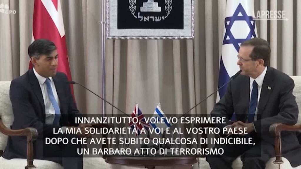 Il premier britannico Rishi Sunak è andato in visita a Gerusalemme e ha incontrato il primo ministro israeliano Benjamin Netanyahu e il presidente Isaac Herzog. “Volevo esprimere la mia solidarietà a voi e al vostro Paese dopo aver subito qualcosa di indicibile, un barbaro atto di terrorismo”, ha detto Sunak a colloquio con Herzog. “Dovremmo chiamarlo per quello che è, un atto di terrorismo perpetrato da un’organizzazione terroristica malvagia, Hamas. Saremo al fianco di Israele. Saremo al vostro fianco in solidarietà con il vostro popolo e con il vostro diritto di difendervi, di riportare la sicurezza nel vostro Paese, di garantire il ritorno sicuro degli ostaggi che sono stati presi. E so che ne parleremo ancora”, ha aggiunto il leader inglese. “Ma vi sono anche grato per il sostegno che il governo israeliano ha fornito alle famiglie dei cittadini britannici che sono stati coinvolti in questa tragedia. Lo apprezzo molto. E so che continueremo a collaborare strettamente e a sostenere i vostri sforzi per garantire il ritorno in sicurezza di tutti gli ostaggi che Hamas ha crudelmente preso”, ha detto ancora.