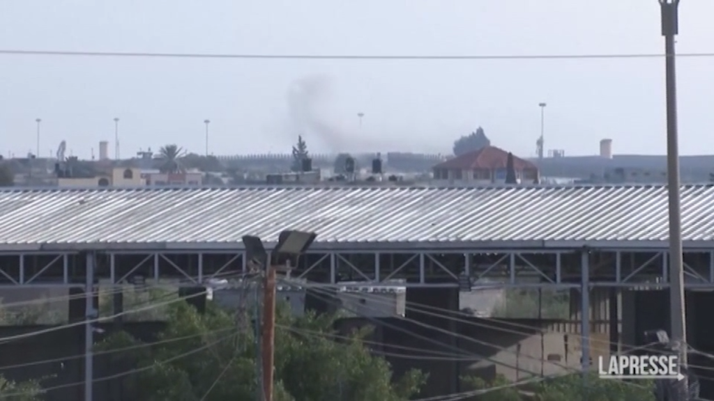 Fumo nero, dopo i bombardamenti israealiani, vicino al valico di Rafah a Gaza. Non è chiaro dove fossero diretti gli attacchi: funzionari egiziani hanno detto hanno colpito vicino al lato egiziano del valico, lasciando almeno un egiziano ferito.
