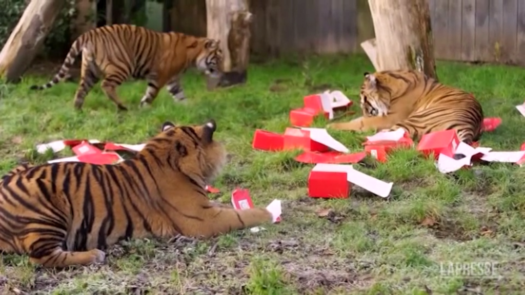 Anche nello zoo di Londra è partito il conto alla rovescia verso il Natale. Giovedì mattina i vari animali hanno giocato con i calendari dell’avvento: le tigri hanno aperto le scatole, le scimmie hanno esaminato le calze di Natale alla ricerca di dolcetti e i suricati hanno frugato in un albero di Natale di legno con minuscole scatole piene di cibo. Tutti non hanno rispettato la tradizione festiva di aprire un’unica porta al giorno, optando invece per una demolizione completa dei contenitori dei dolcetti.
