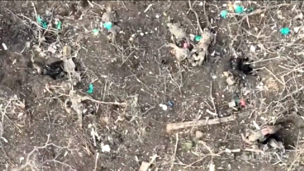I corpi di decine di soldati russi, sparsi lungo le file di alberi dove avevano cercato riparo. Pesanti le perdite delle forze di Mosca, che stanno tentando di conquistare la città di Avdiivka, nell’Ucraina orientale. Le immagini, girate questo mese da un’unità di droni militari ucraini nei pressi di Stepove, un villaggio appena a nord di Avdiivka, dove si sono svolte alcune delle battaglie più intense.