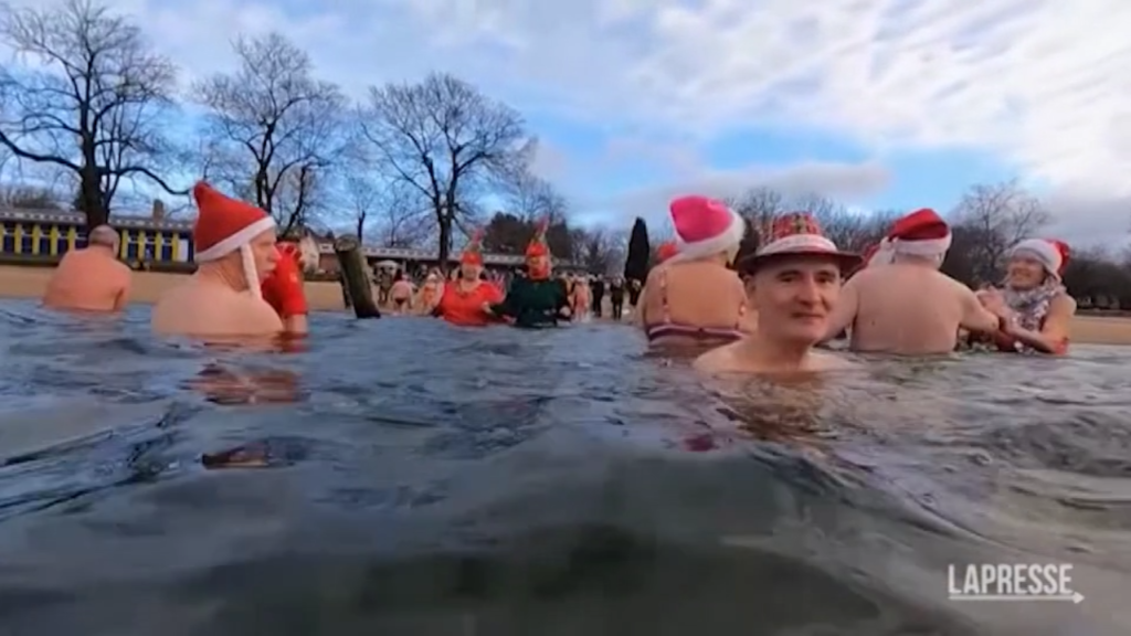 Nella capitale tedesca Berlino i membri di un club di nuoto hanno indossato cappelli di Babbo Natale e si sono tuffati nel lago Oranke per la loro tradizionale nuotata natalizia. La tradizionale risale a 40 anni fa: la temperatura dell’acqua era di 5 gradi.