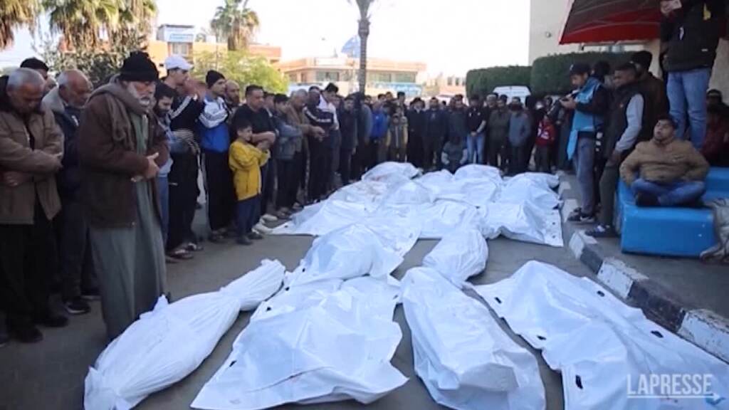 I parenti e gli amici delle vittime del raid di Israele a Zweida, nella Striscia di Gaza centrale, si sono riuniti in preghiera davanti ai corpi dei congiunti. Almeno 13 i morti nell’attacco dell’esercito dello Stato ebraico e decine i feriti. L’ultimo attacco è avvenuto dopo che il primo ministro israeliano Benjamin Netanyahu ha dichiarato sabato scorso che la guerra di Israele contro Hamas a Gaza continuerà per “molti altri mesi”, respingendo le persistenti richieste internazionali di cessate il fuoco. Il Ministero della Sanità di Gaza ha dichiarato che sono più di 21.600 i palestinesi uccisi nell’offensiva aerea e terrestre senza precedenti lanciata da Israele dopo l’attacco mortale di Hamas del 7 ottobre al sud di Israele.