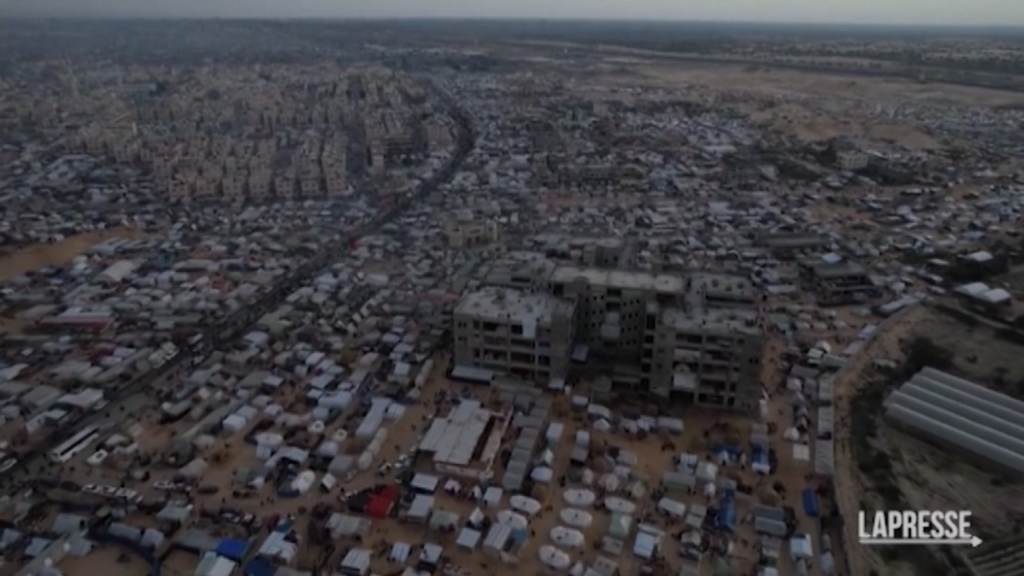 Le impressionanti immagini riprese da un drone a Rafah, nel sud di Gaza, dove sono state costrette a spostarsi migliaia di persone dalle altre zone della Striscia sotto assedio da parte di Israele. Centinaia di tende ricoprono le strade della città al confine con l’Egitto, ormai stracolma di sfollati. Secondo l’Onu, negli ultimi giorni del 2023 più di 100mila persone hanno raggiunto Rafah per trovare rifugio dai raid dello Stato ebraico.