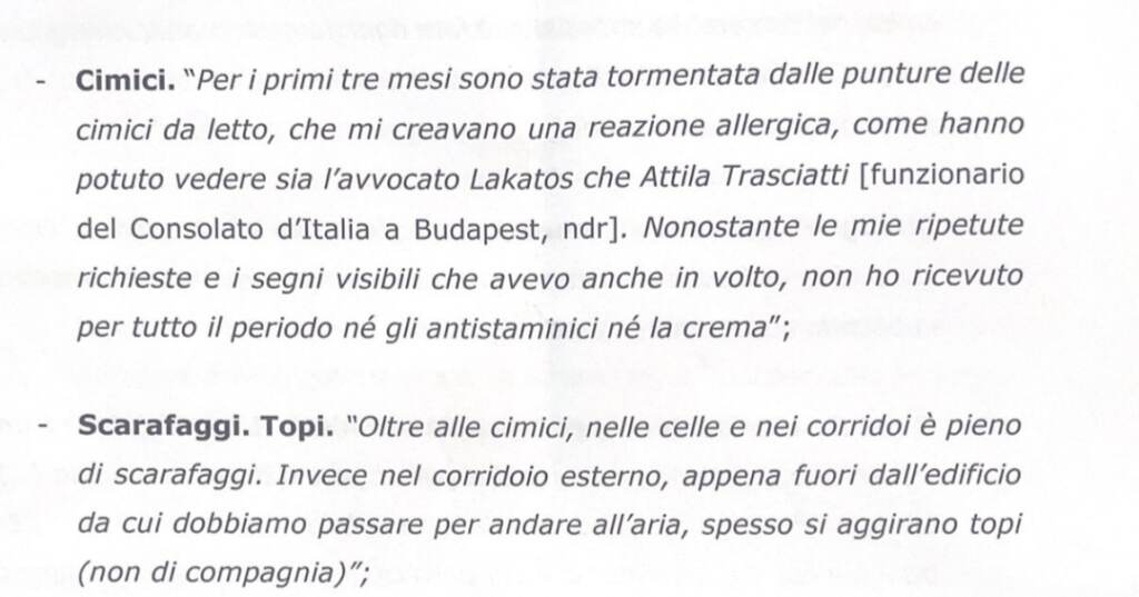 Dopo i topi e gli scarafaggi, anche le cimici nelle celle ungheresi. “Per i primi tre mesi sono stata tormentata dalle punture delle cimici da letto, che mi creavano una reazione allergica, come hanno potuto vedere” un avvocato e un funzionario del Consolato d’Italia a Budapest. Così Ilaria Salis nella lettera inviata il 2 ottobre 2023 ai suoi avvocati in Italia, Eugenio Losco e Mauro Straini, durante la carcerazione preventiva in Ungheria. “Nonostante le mie ripetute richieste e i segni visibili che avevo anche in volto non ho ricevuto per tutto il periodo né gli antistaminici né la crema”, si legge nella missiva recapitata attraverso i diplomatici italiani in Ungheria e anticipata il 29 novembre scorso da LaPresse. “La corrispondenza con gli avvocati e con il Consolato non dovrebbero controllarla. Tuttavia, mi è capitato che una lettera che avevo spedito all’avvocato e che per un errore nell’indirizzo è stata rispedita al mittente, mi è stata riconsegnata con la busta aperta”, aggiungeva Salis.