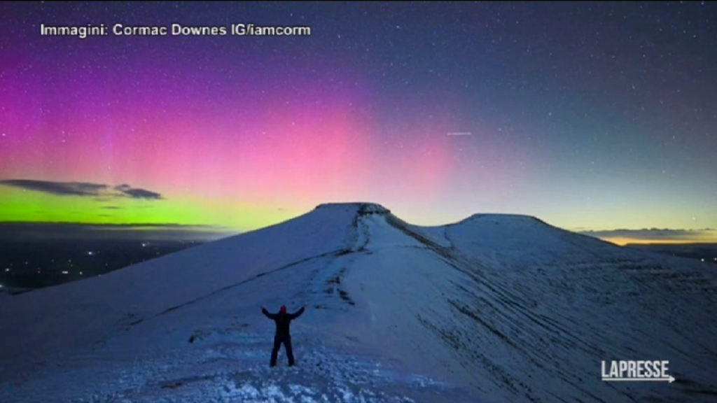 Il fotografo gallese Cormac Downes ha realizzato uno straordinario timelapse dell’aurora boreale sul Galles la sera di domenica 3 marzo. La cortina scintillante dell’aurora boreale ha illuminato il cielo notturno dalla cima del Pen Y Fan, la vetta più alta del Galles meridionale, situata nel Parco nazionale di Brecon Beacons, nella Contea del Brecknockshire.