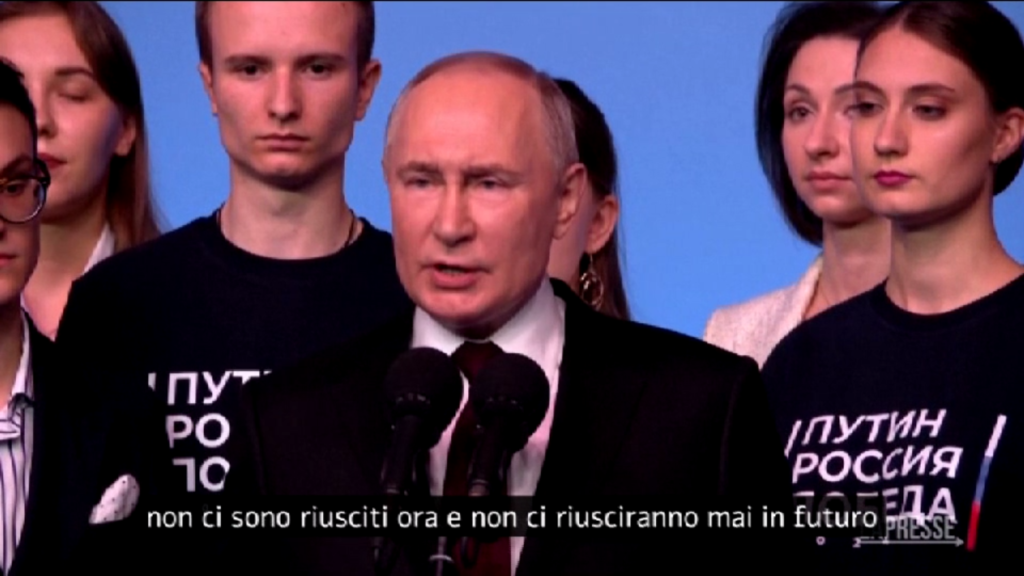 Il Presidente russo Vladimir Putin ha dichiarato che nessuno sarà in grado di intimidire il popolo russo e di sopprimere la sua volontà e la sua coscienza. Putin ha parlato sul palco circondato dai volontari della sua campagna elettorale, dopo che i risultati preliminari indicavano la sua vittoria alle elezioni con circa l’87% dei voti. “Non importa chi e come voglia intimidirci, sopprimere la nostra volontà e la nostra coscienza. Nessuno è mai riuscito a farlo, come ho già detto, non ci sono riusciti ora e non ci riusciranno mai in futuro”, ha detto Putin.