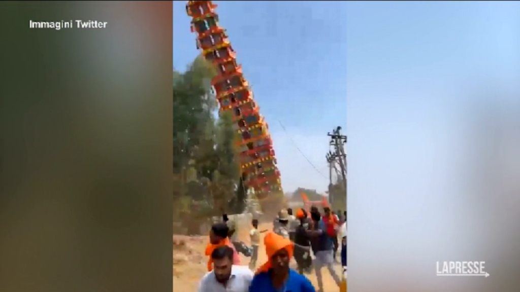 Le impressionanti immagini della caduta a terra di un carro di 35 metri di altezza durante una festa religiosa ad Anekal, in India. Nella cittadina vicino a Bangalore si stava celebrando una processione in onore del tempio di Huskur Madduramma quando i fedeli che sorreggevano la struttura utilizzando delle corde non sono riusciti a mantenerla in equilibrio. Scene di panico al momento del collasso del carro, ma fortunatamente nessuna persona è rimasta ferita nell’incidente.