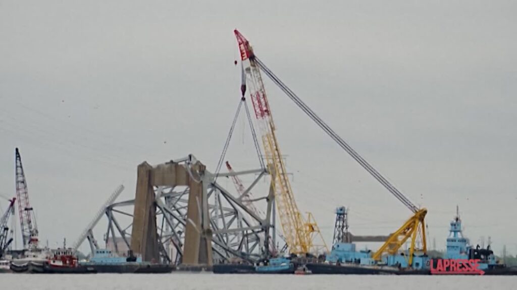 Proseguono i lavori sul luogo del crollo del Francis Scott Key Bridge a Baltimora crollato dopo essere stato urtato dalla nave mercantile Dali lo scorso 26 marzo. La cargo aveva a bordo circa 4.000 container e si dirigeva verso lo Sri Lanka. Tonnellate di detriti si sono riversati nel fiume Patapsco. Finora, le gru hanno sollevato circa 120 container dal Dali, e ne restano altri 20 prima che i lavoratori possano costruire un’area di sosta e iniziare a rimuovere pezzi di acciaio devastato e cemento fatiscente. Nelle immagini le squadre di soccorso rimuovono una enorme sezione del ponte.