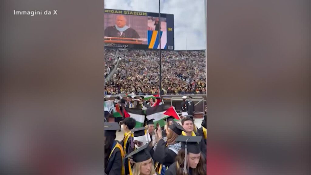 Attivisti pro-Palestina hanno brevemente interrotto la cerimonia di laurea all’Università del Michigan che si teneva sabato al Michigan Stadium ad Ann Arbor. I dimostranti con bandiere e striscioni hanno intonato cori contro “il genocidio” ma la sicurezza li ha tenuti lontano dal palco.
