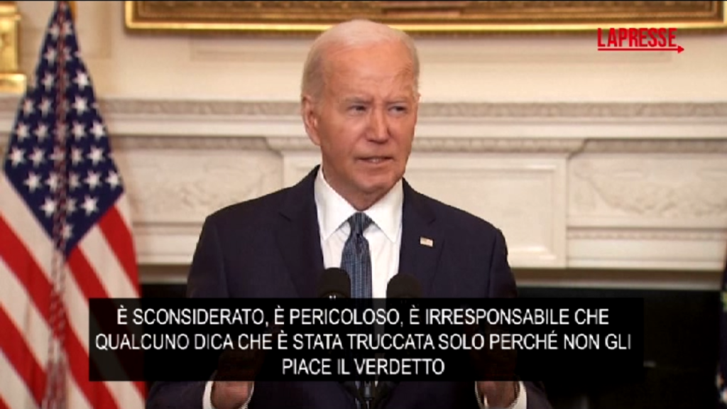 Con la sentenza di colpevolezza nei confronti di Donald Trump è stato “riaffermato il principio che nessuno è al di sopra della legge“. Lo ha detto il presidente Joe Biden, sottolineando che a Trump “sono state date tutte le possibilità di difendersi” e ora “ha l’opportunità di fare appello”. E’ quindi “spericolato, pericoloso e irresponsabile affermare che il processo è truccato perché non ci piace il verdetto”, ha detto il presidente.