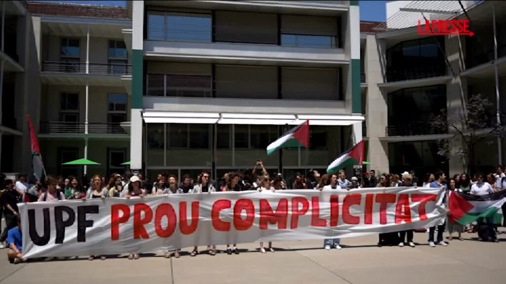 Proteste pro Palestina all’Università catalana Pompeu Fabra nel centro di Barcellona. L’ateneo è uno dei più prestigiosi della Spagna e dell’Europa, una delle poche università pubbliche catalane che ha relazioni con aziende israeliane. Gli studenti chiedono che il rettorato interrompa qualsiasi legame con Israele.