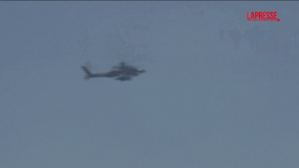 Un elicottero vola al largo della costa della Striscia di Gaza, vicino al sito del un molo costruito dall’esercito americano e progettato per portare aiuti nell’enclave palestinese. Il molo è stato recentemente ricollegato alla spiaggia nel territorio assediato dopo che una sezione si era rotta a causa delle tempeste e del mare agitato, ha riferito il Comando centrale degli Stati Uniti. Il molo è stato operativo solo per una settimana prima che la tempesta lo facesse crollare.