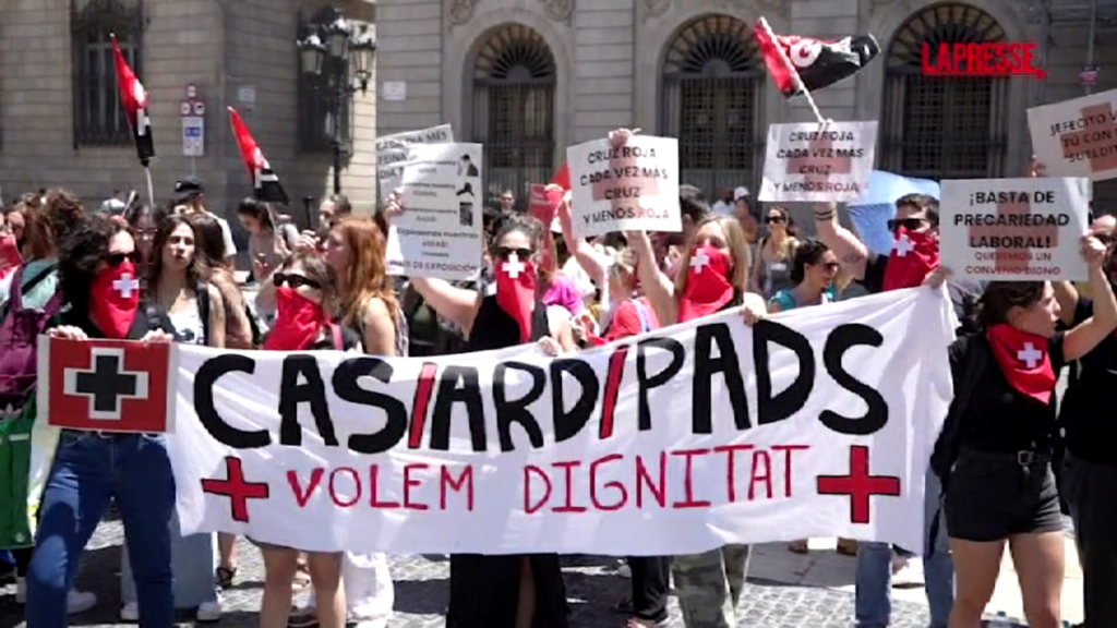 Protesta dei dipendenti della Croce Rossa in Plaza Sant Jaume a Barcellona. I lavoratori chiedono un salario più alto e meno carico di lavoro, rimarcando un paradosso: alcuni dei suoi operatori, a causa dello stipendio molto basso, hanno bisogno di sostegno e aiuti dalla stessa Croce Rossa.