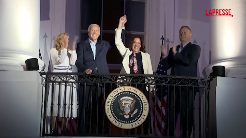 Il Presidente degli Stati Uniti Joe Biden ha assistito allo spettacolo pirotecnico che ha illuminato il cielo notturno di Washington nell’ambito delle celebrazioni del 4 luglio, giorno della festa dell’Indipendenza americana. Biden è stato raggiunto dalla sua famiglia, dalla vicepresidente Kamala Harris e dal ‘Second Gentleman’ Douglas Emhoff mentre salutavano la folla e guardavano i fuochi d’artificio dal balcone della Casa Bianca. A un certo punto, Kamala Harris ha afferrato la mano di Biden e l’ha tenuta alta in aria. Poi i due si sono abbracciati.