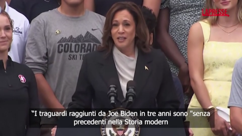 “I traguardi raggiunti da Joe Biden in tre anni sono senza precedenti nella Storia moderna”. Così Kamala Harris ha reso omaggio al presidente Usa, nel suo primo intervento pubblico dopo l’abbandono della corsa elettorale da parte di Biden. “In un mandato – ha detto Harris – (Biden) ha già superato l’eredità di molti presidenti che hanno servito due mandati”, ha detto ancora Harris. La vice presidente e candidata in pectore del Partito democratico è intervenuta in un evento alla Casa Bianca per celebrare i campioni della National Collegiate Athletic Association.