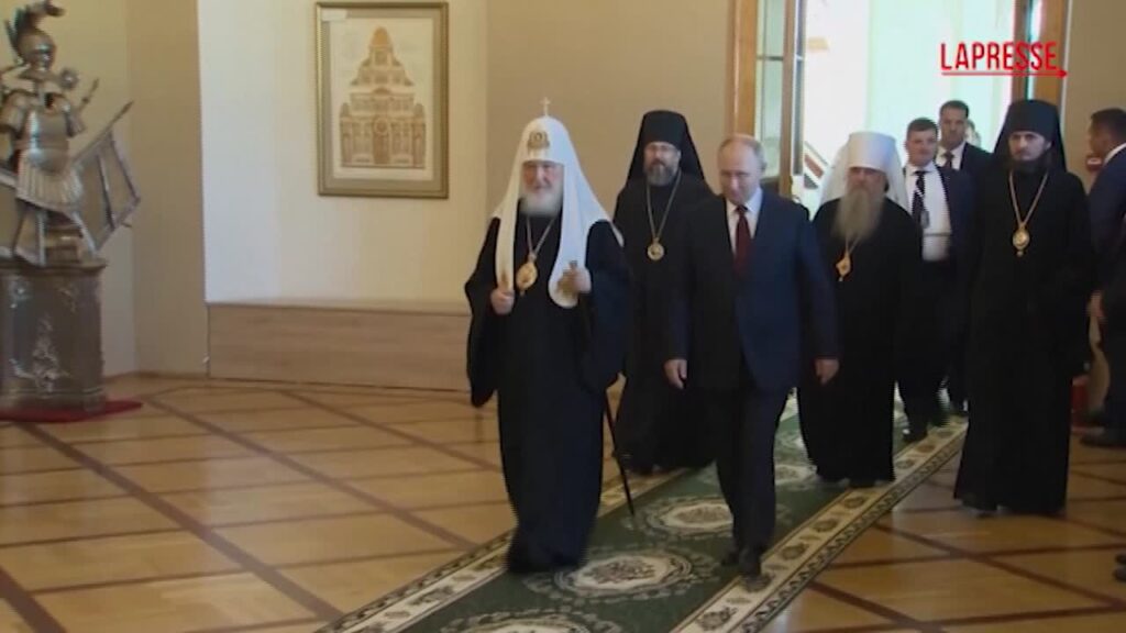 Il presidente russo Vladimir Putin riceve un’onorificenza dal patriarca di Mosca della chiesa ortodossa Kirill presso il monastero di Sant’Alessandro Nevsky a San Pietroburgo in occasione della Giornata della Marina. Kirill ha consegnato a Putin l’Ordine di Alessandro Nevsky, uno dei più alti riconoscimenti della Chiesa ortodossa russa.