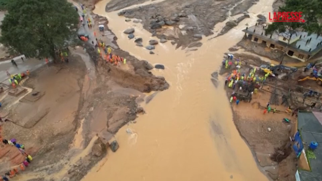 Le immagini riprese da un aereo mostrano la devastazione causata dalle frane provocate dalle forti piogge che hanno colpito i villaggi collinari del distretto di Wayanad, nello Stato meridionale del Kerala, in India. I soccorritori sono al lavoro alla ricerca dei 187 dispersi. I morti accertati sono 151. La maggior parte delle vittime erano lavoratori delle piantagioni di tè. Travolti villaggi e colture.