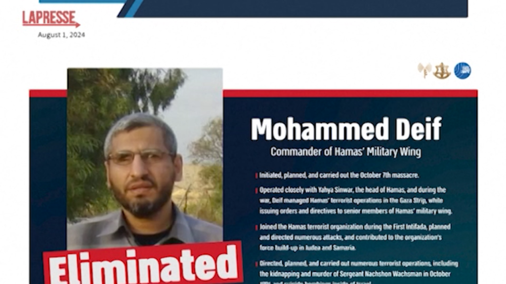 Israele ha annunciato di aver ucciso il capo dell’ala militare di Hamas, Mohammed Deif, in un attacco aereo alla periferia della città meridionale di Gaza, Khan Younis, il 13 luglio. Nel raid sono morti oltre 90 civili e Rafa’a Salameh, il comandante della Brigata Khan Younis di Hamas. L’esercito israeliano ha rivendicato l’attacco pubblicando un filmato che mostra l’impatto del missile.