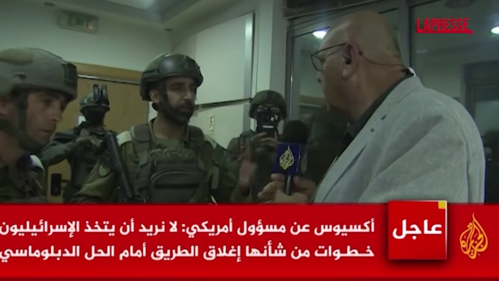 Militari israeliani hanno fatto irruzione nella sede di Al Jazeera a Ramallah, nella Cisgiordania, ordinando all’ufficio di chiudere. Al Jazeera ha trasmesso in diretta sul suo canale in lingua araba un filmato delle truppe israeliane che ordinavano la chiusura dell’ufficio per 45 giorni. Un soldato israeliano ha detto al capo della sede locale dell’emittente, Walid al-Omari, nel filmato in diretta: “C’è una sentenza del tribunale che prevede la chiusura di Al Jazeera per 45 giorni. Le chiedo di prendere tutte le telecamere e di lasciare l’ufficio in questo momento”.