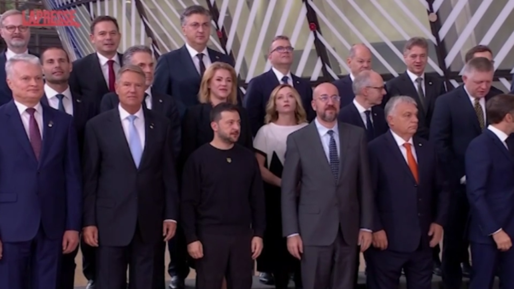 Al via il Consiglio europeo dei 27 leader a Bruxelles, sul tavolo del vertice il tema migranti e il sostegno all’Ucraina. Presente al summit anche il presidente Volodymyr Zelensky che presenterà il suo “piano di vittoria” per porre fine alla guerra con la Russia. Nelle immagini i leader scattano la foto di gruppo prima di entrare in aula.
