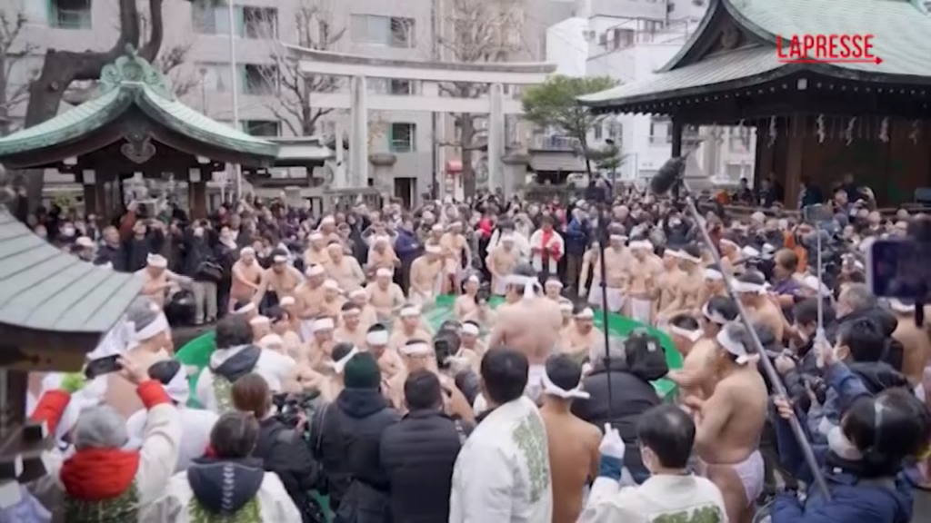 Circa 80 fedeli si sono immersi nell’acqua ghiacciata in un santuario di Tokyo per pregare per la buona salute. Gli uomini indossavano solo i tradizionali perizomi, mentre le donne indossavano abiti bianchi per immergersi durante la tradizionale festa di Capodanno, nota anche come “Kanchu Misogi”, al santuario Teppozu Inari. Quest’anno si è celebrato il 70° anniversario della “Festa del bagno”. I partecipanti hanno eseguito il rituale di riscaldamento, che prevede movimenti di voga noti come “torifune”, prima di immergersi nell’acqua fredda.