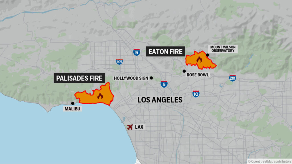 Due i fronti principali di fuoco negli incendi che stanno devastando da giorni la zona di Los Angeles, in California. Uno è il Palisades Fire, che sta mandando in cenere la zona costiera, fino a Malibù. L’altro è l’Eaton Fire, che invece sta agendo nella parte alta della città, ed è visibile in modo netto dal Griffith Observatory. Questo è il fronte che sta devastando l’area di Hollywood, minacciando, o mandando in cenere, anche le ville di tante star famose, e avvicinandosi in modo pericoloso anche alla scritta ‘Hollywood’ sulla collina famosa in tutto il mondo.