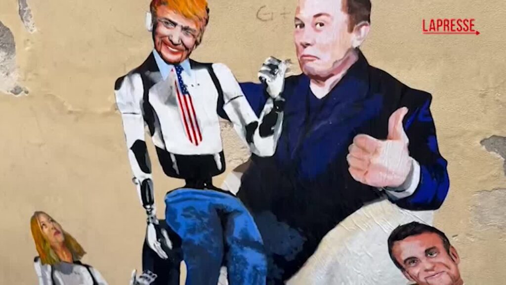 L’opera rappresenta Elon Musk nelle vesti di un burattinaio che tiene i fili del tycoon. Più in basso, in piccolo, Giorgia Meloni ed Emmanuel Macron ancora in forma di bambole che guardano verso i due personaggi al centro della scena.