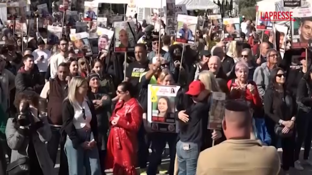 Applausi e lacrime di commozione tra i parenti degli ostaggi israeliani riuniti con cittadini in piazza a Tel Aviv per assistere al rilascio e alla consegna di Agam Berger alla Croce Rossa nella Striscia di Gaza. La soldatessa israeliana è il primo degli otto ostaggi che vengono liberati giovedì 30 gennaio, secondo l’accordo di cessate il fuoco tra Israele e Hamas. La Jihad islamica palestinese rilascia altri due ostaggi la 29enne Arbel Yehud e Gadi Mozes, 80 anni e 5 lavoratori thailandesi, prevista anche la scarcerazione di 110 detenuti palestinesi dalla carceri israeliane.