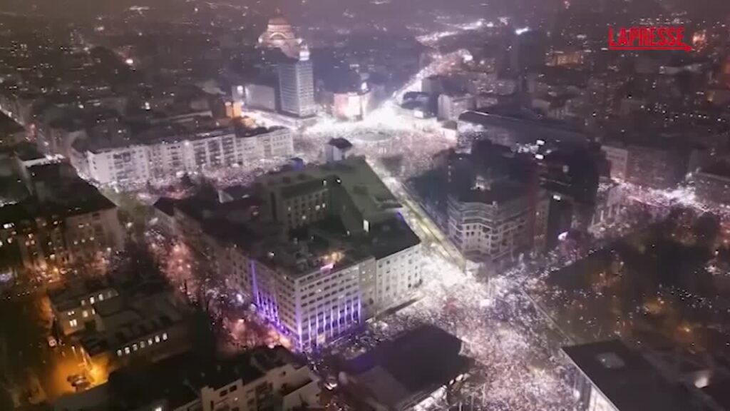 Centinaia di migliaia di manifestanti sono scesi di nuovo in piazza a Belgrado per protestare contro il governo di Vucic, accusato di corruzione. Una protesta silenziosa che ha illuminato la notte della capitale serba con le torce di un’infinità di cellulari, riprese in questo video da un drone. In Serbia le manifestazioni proseguono da mesi: sono iniziate dopo il crollo di una tettoia in cemento nella stazione di Novi Sad, nel nord del Paese, che nel novembre scorso ha ucciso 15 persone, e in molti hanno attribuito la colpa dell’incidente alla corruzione dilagante del governo, alla negligenza e al mancato rispetto delle norme di sicurezza delle costruzioni. Fonti di polizia dicono che oltre 100mila persone hanno manifestato sabato 15 marzo a Belgrado, mentre l’organizzazione indipendente Arhiv javnih skupova ha stimato fra le 275mila e le 325mila presenze. Il presidente Vucic ha comunicato che al termine della giornata si sono contati 56 feriti e 22 arresti.