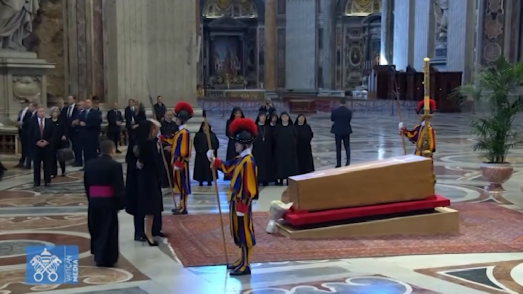 Donald Trump e la moglie Melania entrano nella Basilica di San Pietro prima dell’inizio dei funerali di Papa Francesco. Il presidente Usa e la moglie restano in raccoglimento per qualche minuto davanti alla bara chiusa di Bergoglio.