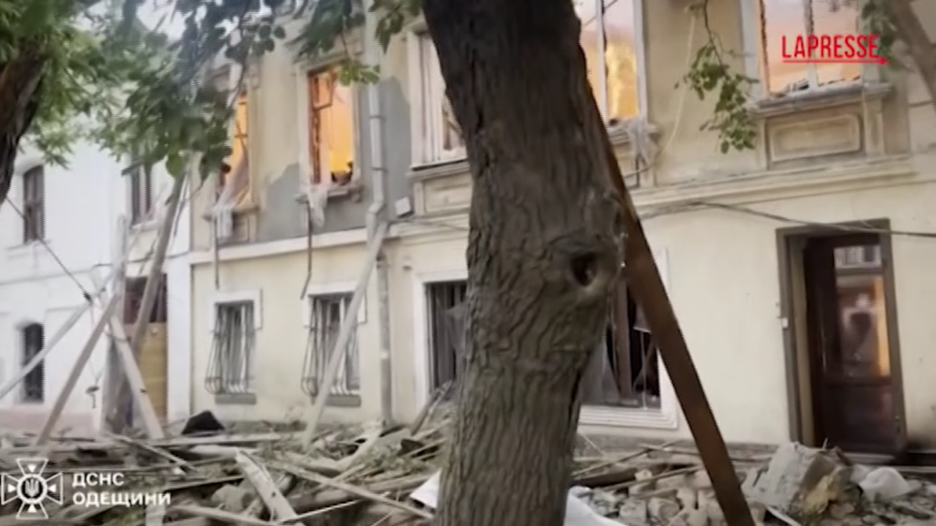 Feriti con il volto ricoperto di polvere vengono soccorsi dai servizi di emergenza tra le macerie di un edificio colpito da un drone russo a Odessa, in Ucraina. Un uomo con il volto ricoperto di polvere esce dalla sua casa con in braccio un gatto. Nell’attacco una persona è morta e altre 17 sono rimaste ferite, tra cui una ragazza di 17 anni e una donna incinta. Mosca ha attaccato duramente l’Ucraina nella notte con raid su Zaporizhzhia, Chernihiv, Zhytomyr, Kirovohrad, Mykolaiv e Kiev, causando 15 morti e 17 feriti.