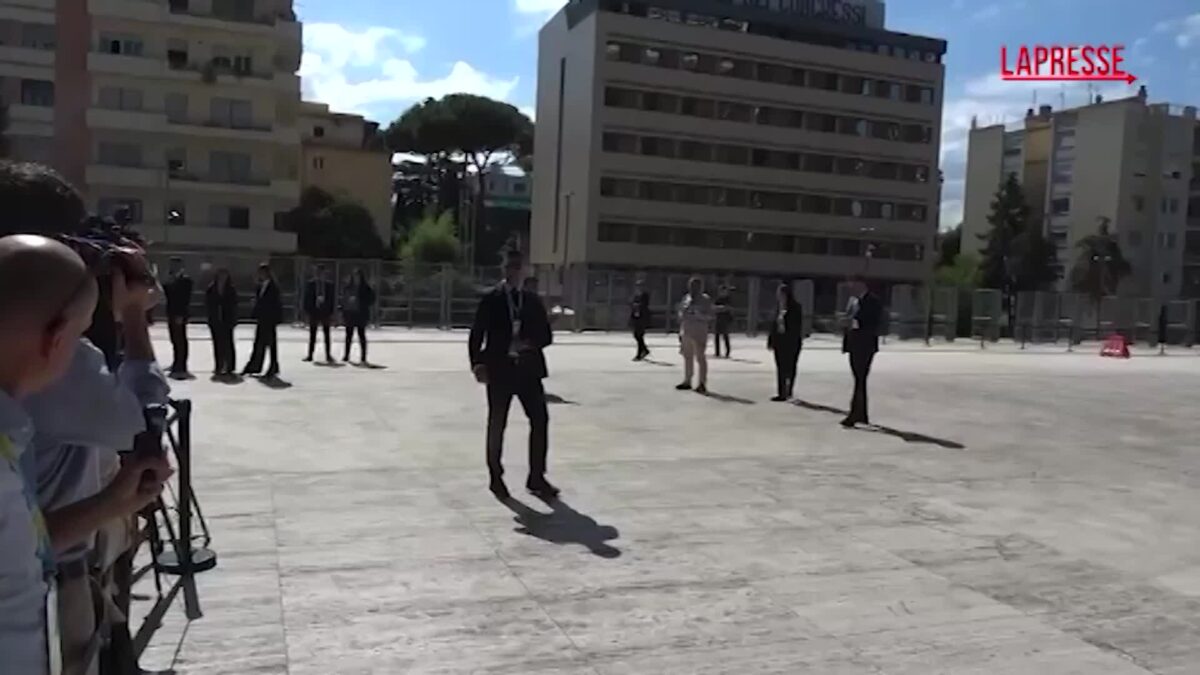 Il cancelliere tedesco Friedrich Merz arriva al centro congressi La Nuvola di Roma per la Ukraine Recovery Conference.