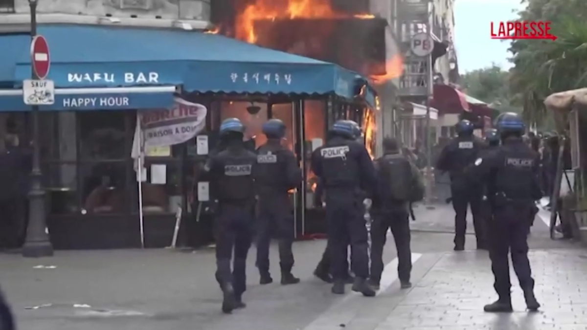 Vigili del fuoco in azione nel quartiere di Châtelet, nel centro di Parigi, dopo che un incendio è divampato in un ristorante, minacciando di propagarsi a un edificio adiacente. Gendarmi e agenti di polizia hanno evacuato una alla volta le persone all’interno del locale e hanno domato le fiamme che hanno interessato soprattutto la facciata dell’edificio. Nella capitale francese e in molte altre città della Francia sono in corso le proteste del movimento ‘Bloquons Tout’ dopo la nomina del nuovo premier Sébastien Lecornu da parte del presidente Emmanuel Macron, al posto del dimissionario François Bayrou.