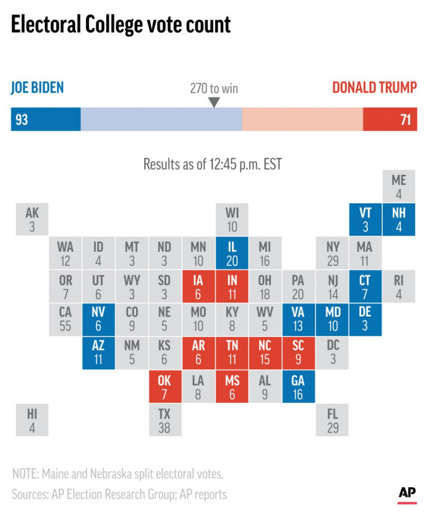 Gli elettori si incontreranno in tutti i 50 stati e nel distretto di Columbia per votare. I risultati saranno inviati a Washington e conteggiati in una sessione congiunta del 6 gennaio del Congresso che sarà presieduta dal vicepresidente Mike Pence. I voti degli elettori ha attirato più attenzione del solito quest’anno perché il presidente Donald Trump si è rifiutato di riconoscere la vittoria del rivale e ha continuato ad avanzare accuse infondate di frode. Biden ha in programma di rivolgersi alla nazione lunedì sera, dopo che gli elettori avranno votato.