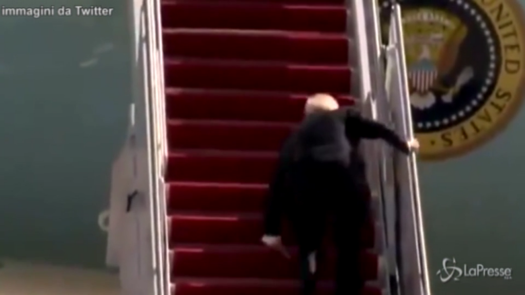 (LaPresse) – Il presidente americano Joe Biden è inciampiato per ben tre volte mentre saliva sulla scaletta dell’Air Force One per volare ad Atlanta. Nelle immagini il leader Usa, 78 anni, scivola mentre sale i gradini dell’aereo sferzato dal vento, per poi rialzarsi e ripulirsi i pantaloni. Raggiunta la fine della scaletta Biden ha fatto il saluto militare prima di entrare nel velivolo. DISTRIBUTION FREE OF CHARGE – NOT FOR SALE